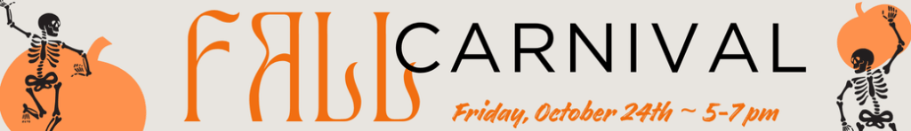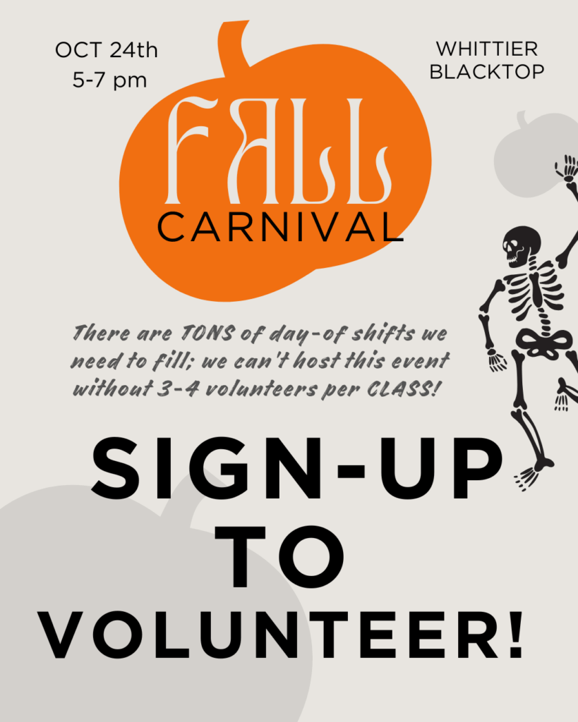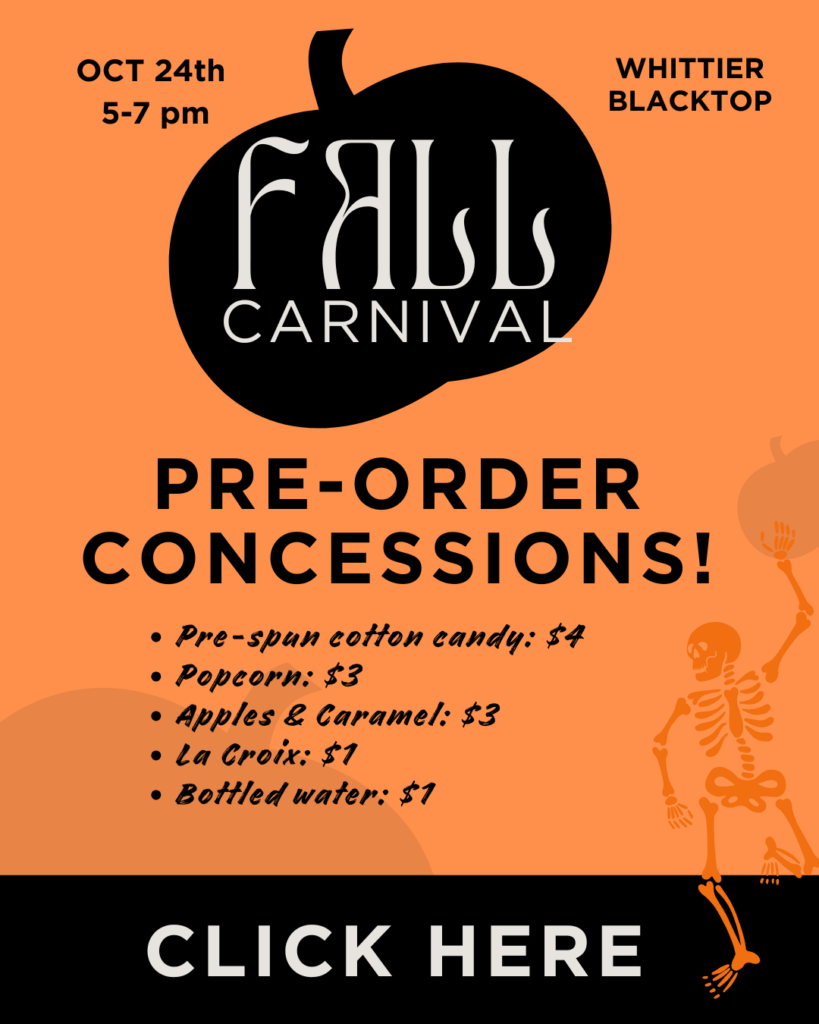 Get ready for an evening of family and community fun (costumes welcomes!) at Whittier PTA’s Fall Carnival on Friday, October 24th from 5-7pm on the Whittier Blacktop!